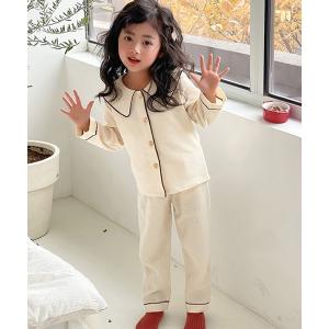 パジャマ キッズ 長袖ワッフルパイピングラウンドカラールームウェア 上下2点セット キッズ 子供 女の子