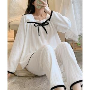 パジャマ ルームウェア 「セットアップ」リボン付き フリース 上下セット ルームウェア パジャマ レディース