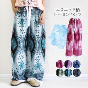 タイパンツ ワイドパンツ レディース エスニック ファッション 花柄 プリント 総柄 個性的 アジアン ロングパンツ イージーパンツ 大きいサイズ ウエストゴム
