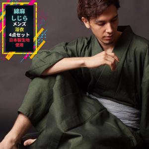 浴衣 メンズ/送料無料/男性 浴衣/浴衣 +帯+下駄+腰紐/国産高級生地使用 浴衣 セット・ 4点 セット/セット/しじら織り/深緑/無地/日本製生地