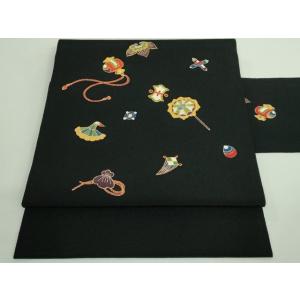 平和屋着物■極上 銀座越後屋 九寸名古屋帯 駒刺繍 宝尽くし 黒地 金糸 鬼しぼ縮緬 逸品 DZAB0746kh5