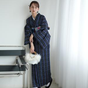 着物 袷着物 ブルー×ブラックのタータンチェック 洗える着物 きもの単品 秋 冬 カジュアル 女性 大人 レディース 着付け お稽古 Lサイズ ポリエステル着物