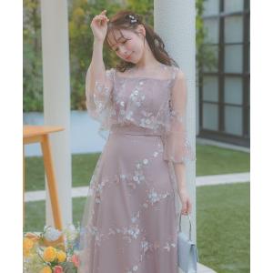 ドレス 「LEJA」チュールオフショルダー花柄Iラインドレスワンピース 2点セット 美脚効果 結婚式 パーティードレス 成人式 二次会 同窓会 お呼ば