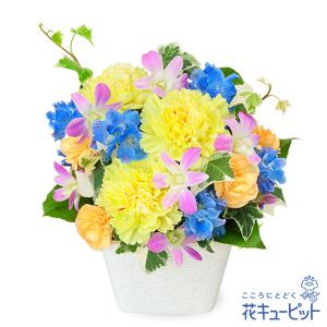 【お祝い】花キューピット 敬老の日 誕生日 記念日 結婚祝い 歓送迎 還暦 開店開業 卒業入学 生花 オレンジバラと黄色のアレンジメント