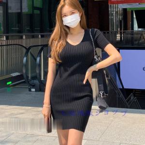 夏 ニットワンピース タイト 半袖 きれいめ 大人 韓国ファッション Vネック リブニット ボディコンワンピース 無地 膝上丈 レディース 大人 着痩せ オフィス