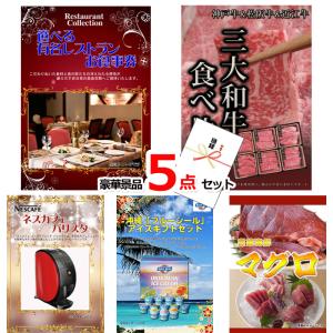 忘年会 新年会 結婚式 二次会 ビンゴ 選べる有名レストランお食事券&三大和牛食べ比べ&バリスタ他豪華5点セット 景品パネル&引換券付き目録 15081