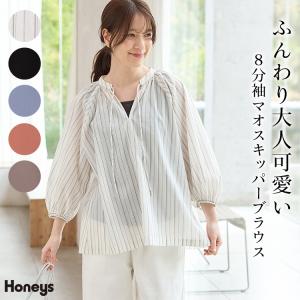 トップス ブラウス マオスキッパー 無地 ストライプ柄 ラグランスリーブ ギャザー カジュアル レディース Honeys ハニーズ 8分袖マオスキッパーブラウス