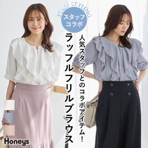 トップス ブラウス スタッフコラボ オフィス きれいめ フリル キーネック ジョーゼット素材 無地 5分袖 レディース Honeys ハニーズ ラッフルフリルブラウス