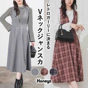 ワンピース ジャンスカ ノースリーブ ロング丈 大きいサイズ Vネック 無地 チェック柄 ストレッチ ツイル素材 レディース Honeys ハニーズ Vネックジャンスカ
