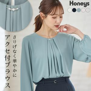 トップス ブラウス 長袖 大きいサイズ オフィス きれいめ アクセサリー付き フェミニン レディー Honeys ハニーズ アクセ付ブラウス