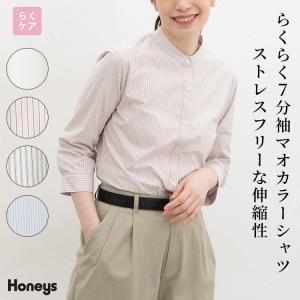 トップス シャツ ブラウス 大きいサイズ らくらくアイロン マオカラー 無地 ストライプ柄 伸縮性 レディース Honeys ハニーズ らくらく7分袖マオカラーシャツ
