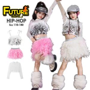 韓国 舞台服 キッズ ダンス 衣装 演出服 K-POP セットアップ 子供ダンス服 黒 白 スパンコール ベスト ネットトップス フェザースカート モコモコ レッグウォー
