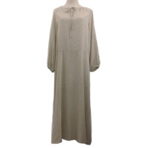ミラオーウェン ワンピース フレア ロング プルオーバー 総柄 ギャザー リボン ラグランスリーブ 長袖 0 ベージュ 黒 ブラック レディース