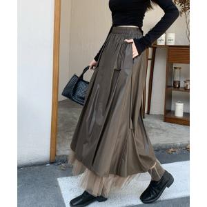 スカート レイヤード風チュールドッキングタックレザースカート