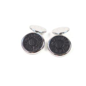 美品○HERMES エルメス セリエデザイン ロゴ刻印 レザー使い ラウンドシェイプ カフスボタン カフリンクス ブラック シルバー メンズ