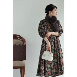 ワンピース ヴィンテージ風花柄プリントのコットンコーデュロイミディアムワンピース