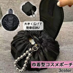 化粧ポーチ メイクポーチ 巾着型 ストラップ付き パール調ストラップ コスメポーチ きんちゃくポーチ レディース 大容量 収納袋 小物入れ コスメ収納