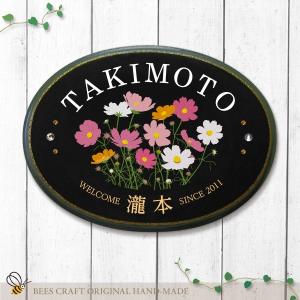 表札 おしゃれな木製表札 クリスタルデコ表札 英国風 コスモス M ラインストーン スワロ 戸建て サロン ハウスサイン 秋桜 楕円 データ入稿可 簡単取り付け