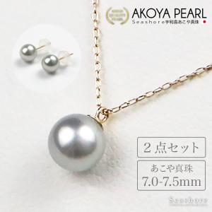 アコヤ真珠 ピアス イヤリング ネックレス 2点セット レディース グレー 7.0-7.5mm K18G K14WG silver925 K10YG 保管用厚紙製ケース付 コバルト ブルー 両耳用