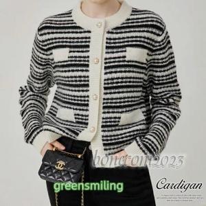 ニットカーディガン パールボタン 細ボーダー クルーカーディガン リブニット 暖かい フリーサイズ ボーダーフリーサイズ カジュアル 大人可愛い 韓国 韓国ファ