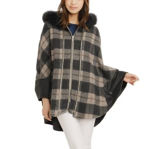 (ケープ ポンチョ) カシミヤ ケープ マント フード チェック フォックス ファー / レディース