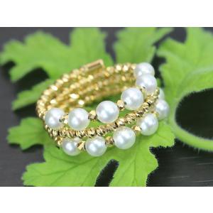 パール・真珠3.5mm 12珠のアコヤが艶めく 3連 形状記憶ワイヤーでサイズ自在調整可能 K18YG リング 指輪 受注品