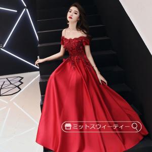 カラードレス ウエディングドレス パーティードレス 演奏会 発表会 赤 花嫁 イブニングドレス ブライダル 二次会 ロングドレス オフショルダー 披露宴 レッド