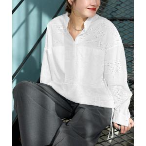 はちみつ堂 つづる刺繍ブラウス レディース シャツ プルオーバー 長袖 パフスリーブ バルーンスリーブ バンドカラー ノーカラー レース 綿 コットン トップス