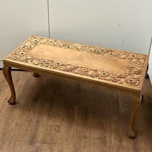 【引取限定※一部割れ・クラックあり※】手彫り装飾 × 多色ストーン装飾 アンティーク風 ローテーブル 木彫りテーブル ●107342