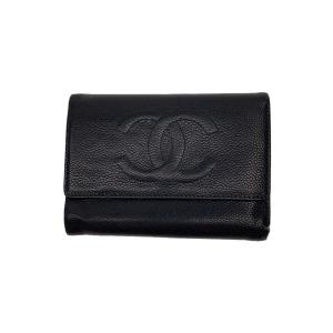 CHANEL◆キャビアスキン/ココマーク/パイピング割れ/3つ折り財布/レザー/BLK/レディース