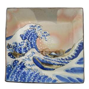 京焼:花月窯【富士・波裏 角皿 】葛飾北斎 富嶽三十六景 神奈川沖波裏 絵柄◆陶器 皿 角皿 日本製