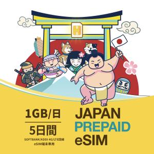 日本プリペイドeSIM 5日間 毎日1GB更新 KDDI/Softbank回線 日本国内専用 4G/LTE対応 データ通信専用 esim対応機種 旅行 一時帰国 格安eSIM