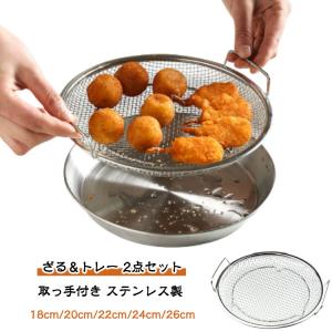 両手ザル 2点セット 盛ざる 盆ざる お皿のざる ステンレス 取っ手付き 丸ざる 浅型 丸型 トレー付 丸型 水切りざる そば 水切り 油切り 揚げ物