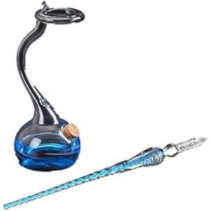 ガラス瓶 と ガラスペン セット 署名 書道 アート 絵画 装飾 つけペン 万年筆 透明 インクボトル MDM(水色)