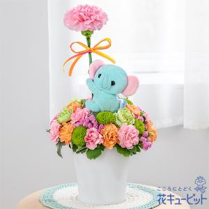 【母の日ギフト】花キューピット 日付指定可 カーネーション 60代 70代 送料無料 空色ぞうさんのマスコット付きアレンジメント