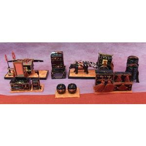 豆お道具七品セット 12号 雛人形道具 豆道具 ひな人形用のお道具セット ミニサイズ 雛道具 行器 箪笥 挟箱 長持 鏡台 針箱 火鉢 御駕籠 重箱 牛車