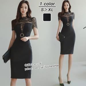 タイトワンピース 膝丈 レディース レース切り替えワンピース パーティドレス結婚式 半袖ワンピ 着痩せ スリム セクシー エレガント フェミニン 飲み会披露宴