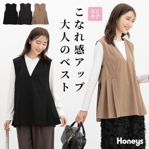 トップス ベスト カットソー ノースリーブ イージーケア シワになりにくい 脇プリーツ カットジョーゼット素材 レディース Honeys ハニーズ 脇プリーツベスト