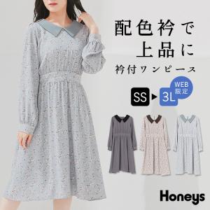 ワンピース 長袖 ひざ丈 大きいサイズ 衿付き 配色 無地 花柄 後ウエストゴム 裏地付き ガーリー 小さいサイズ レディース Honeys ハニーズ 衿付ワンピース