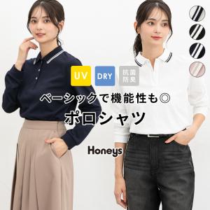 トップス カットソー 長袖 UVカット 吸水速乾 抗菌 抗菌防臭 防臭 衿付き 綿混 無地 ライン カジュアル レディース Honeys ハニーズ ポロシャツ