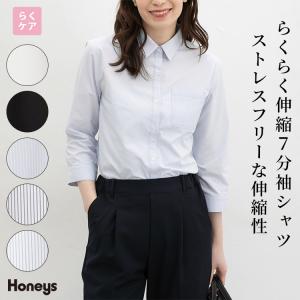 トップス シャツ ブラウス 大きいサイズ らくらくアイロン レギュラーカラー 無地 ストライプ柄 伸縮性 レディース Honeys ハニーズ らくらく伸縮7分袖シャツ