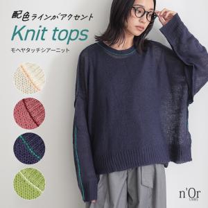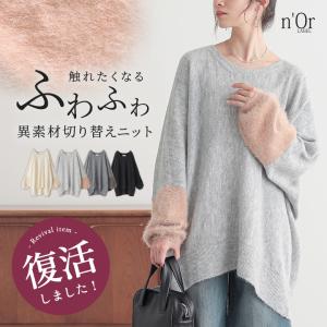 ニット 長袖 レディース トップス 異素材 配色 フェザー調 ラウンドネック セーター ギャザー ふわふわ 体型カバー お尻が隠れる 秋 冬「メール便不可」「30」