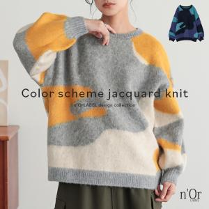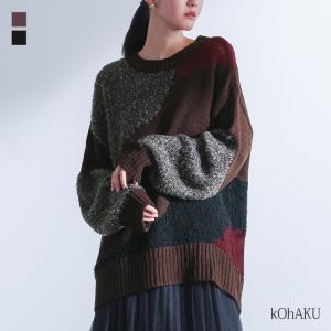 ニット 長袖 レディース トップス セーター クルーネック プルオーバー ぽわん袖 ジャカード ジャガード 配色 起毛 差し色 秋 冬「メール便不可」「30」