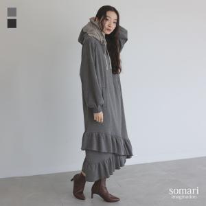 ワンピース 裏シャギー あったか レディース パーカーワンピース 長袖 ロング丈 フード付き アシンメトリー フリル レース 裏起毛 秋 冬「メール便不可」「40」