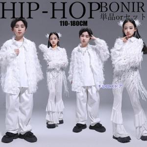 ジャズ ダンス衣装 キッズ 女の子 ヒップホップ セットアップ 真っ白 もこもこシャツトップス へそ出し スーツパンツ フレアパンツ k-pop 応援団 団体服 ジュニ