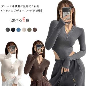 ボディースーツ レディース ボディブリファ 長袖 カットソー Vネック リブニット オールインワン つなぎ ツナギ レオタード タイト 肌着 インナー