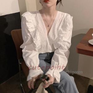 ラッフルレースVネックトップス ブラウス プルオーバー レディース 韓国ファッション オルチャン ガーリー