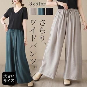 ワイドパンツ レディース ゆったり 無地 夏用 細見え 脚長効果 ウエストゴム 大きいサイズ ストレート ぽっちゃり LL 3L 4L 5L 6L