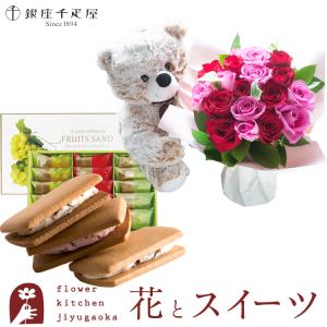 花とスイーツセット くまのマックスと18本バラスタンディングブーケ+ 銀座千疋屋 銀座フルーツサンド FKAASW