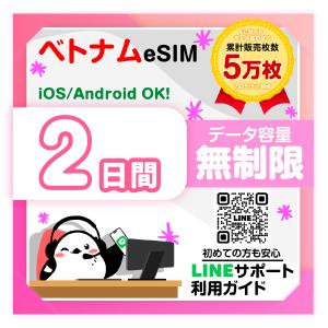 ベトナムeSIM:使用日数:2日間/データ容量:無制限/簡単設定/有効期限90日/最短即日発行/パスポート番号不要/データ通信専用